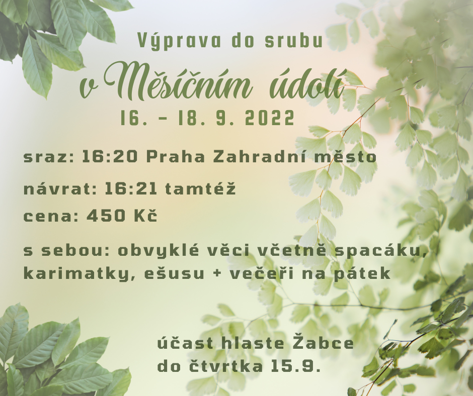 Už o víkendu vyrazíme na první výpravu. Sraz je na nádraží Zahradní město v pátek v 16:20, návrat tamtéž v neděli v 16:21. S sebou obvyklé věci, věčeři na pátek a 450 Kč. Těšíme se!